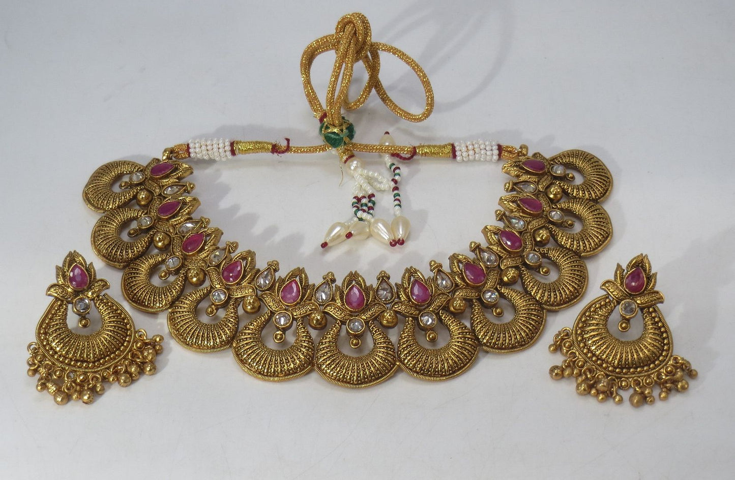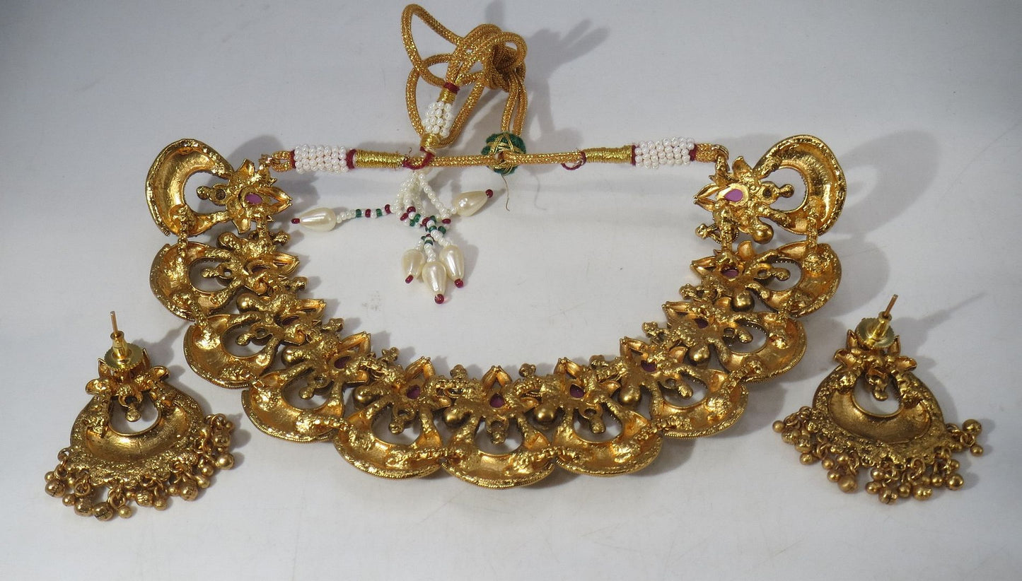 Colour - Red , Weight - 106 Grams ,, Set Width 4.5 Cms. , Set Length 21 Cms. , Plating - Antique , Earrings Length - 5.5 Cms. Earrings Width - 4 Cms.