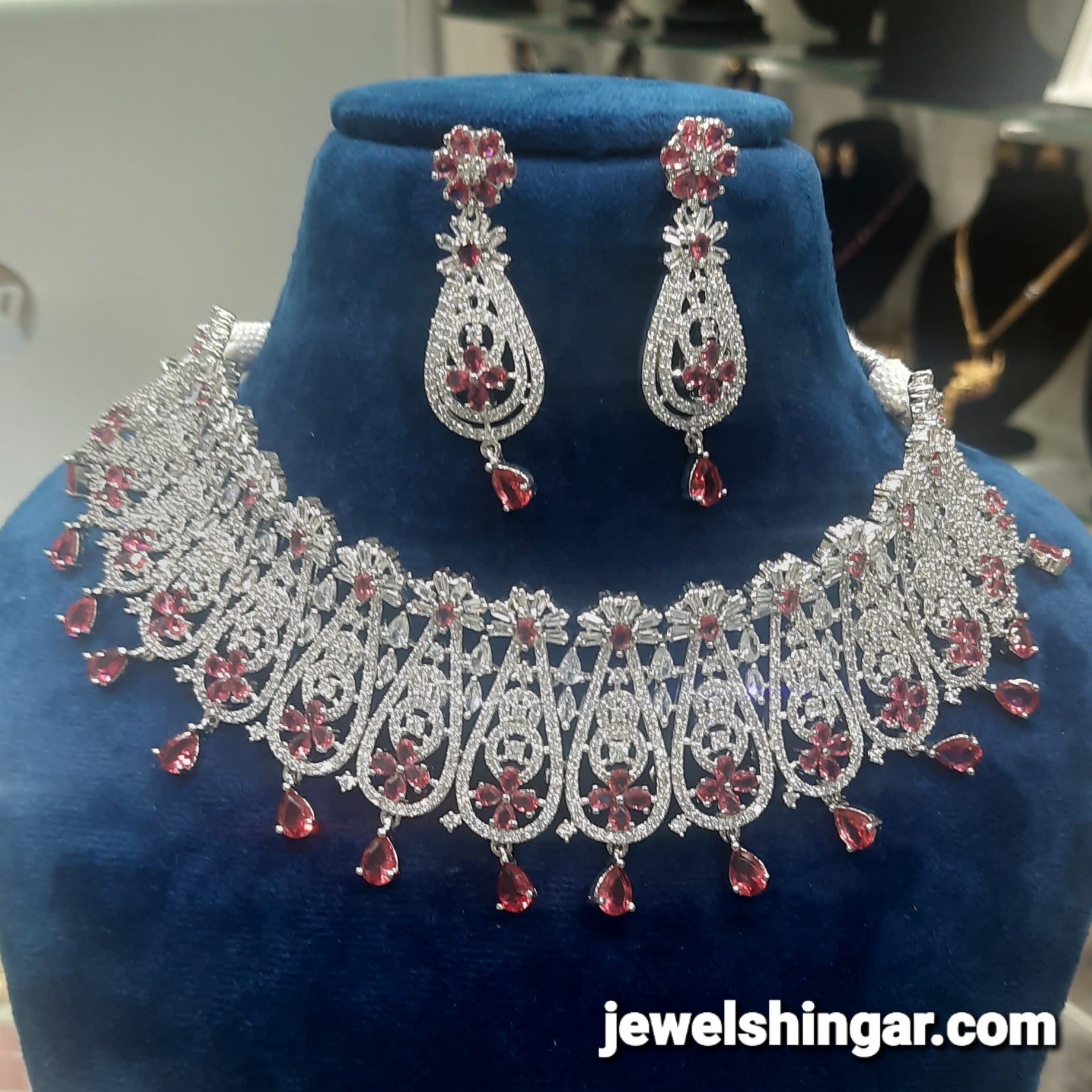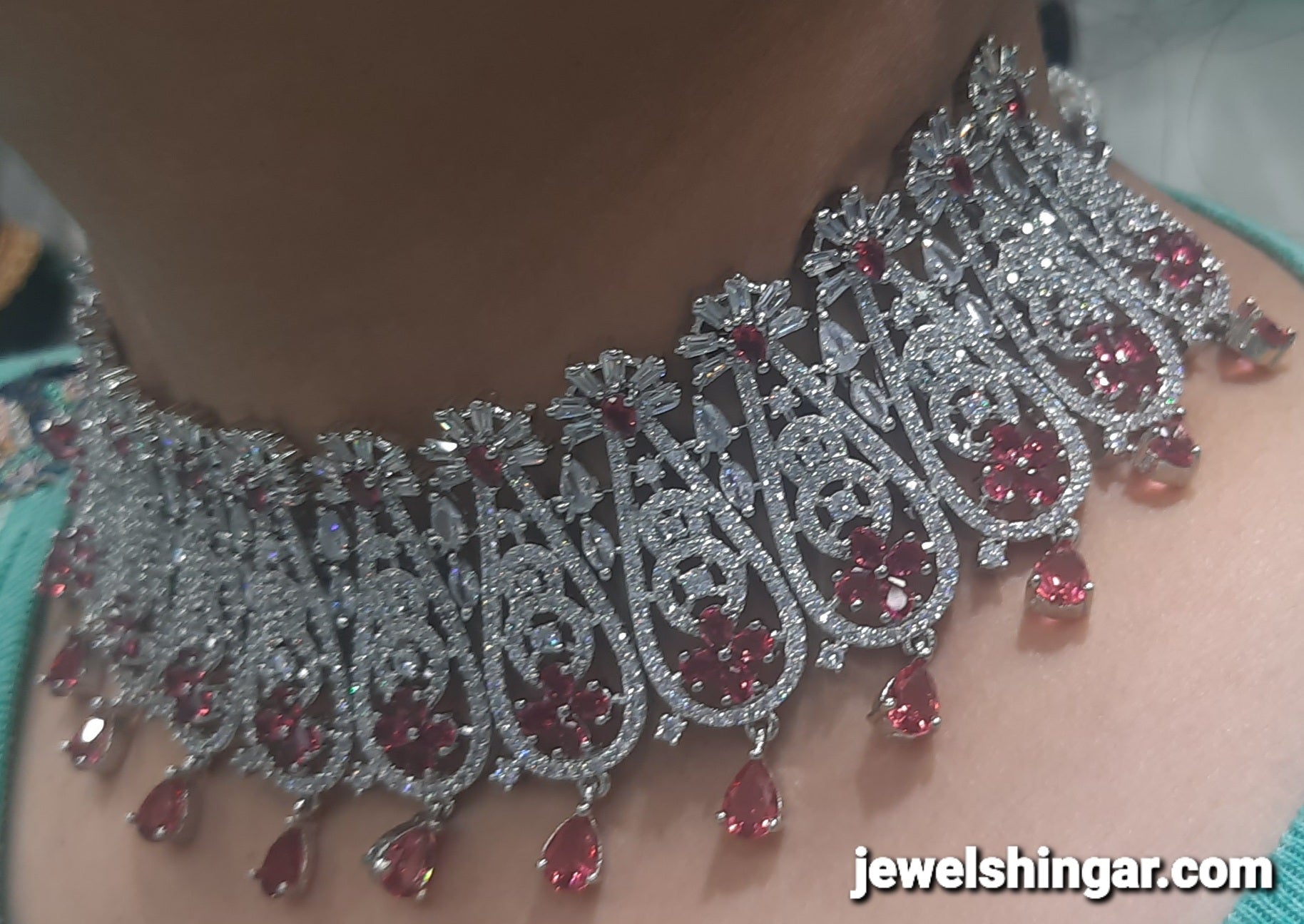 JEWELSHINGAR FINE RUBY ZIRCON SILVER PLATED DIAMOND LOOKING NECKLACE SET IN CHOKER STYLE WITH EARRINGS FOR GIRLS (233653JS)