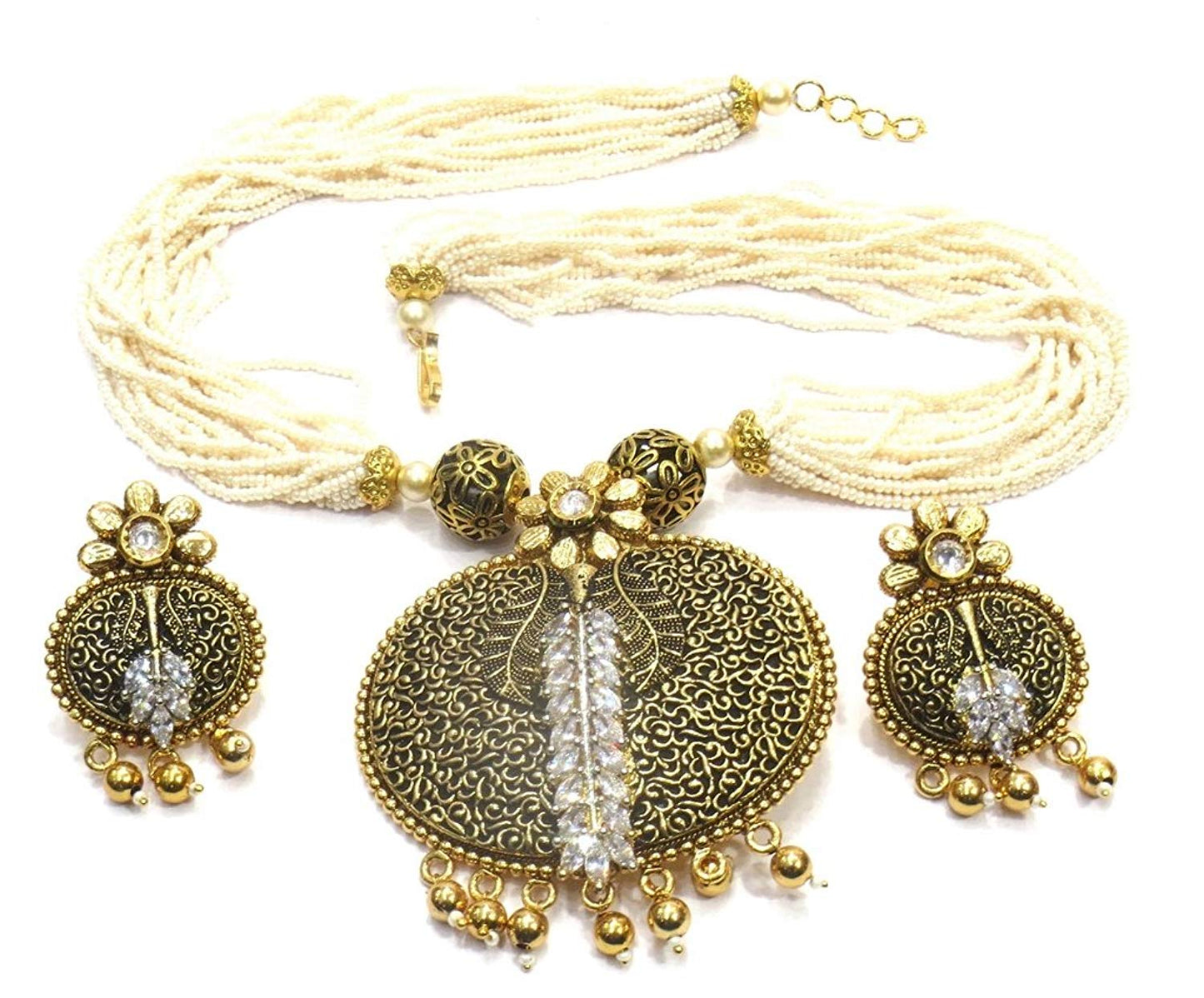 - Pendant Set Plating - Gold , Colour - Gold , Length - 32 Cms. , Width - 7 Cms. , Weight - 124 Grams , Earrings Length 5 Cms., Earrings Width 3.5 Cms.