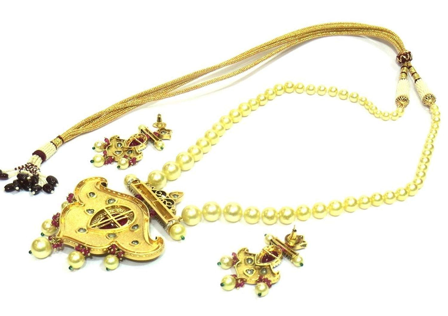 - Pendant Set Weight - 102.5 Grams , Colour - Clear , Plating - Gold , Length - 29 - Cms. , Width - 7 - Cms. Earrings Length - 5 - Cms. , Earrings Width - 2.5 - Cms.